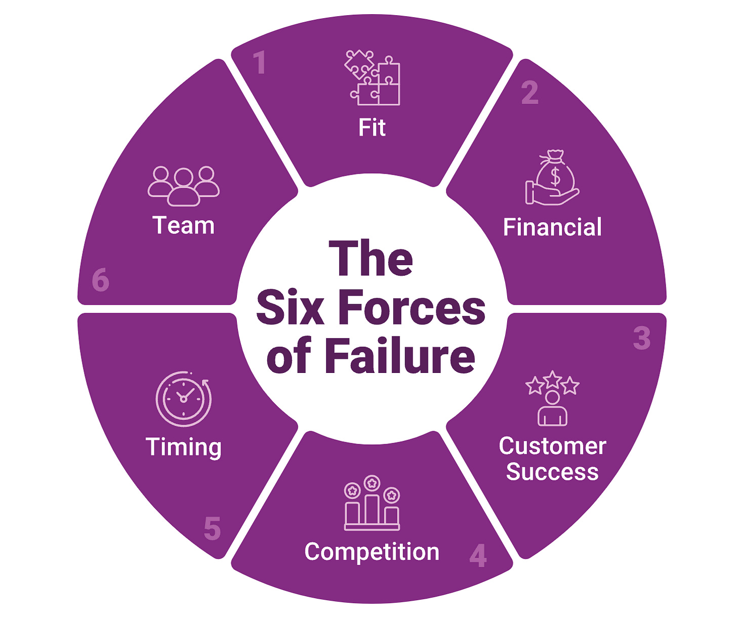 Building something no one wants or going after too many segments too fast; too many or poorly integrated M&A, high burn rate, or unrealistic valuation; having a problematic ICP (too small, too big) or ignoring customer feedback; undifferentiated product or a competitor with deeper pockets; disruptive regulation, lack of infrastructure, inability to adapt to changes; poorly defined incentives, leadership without stage-related experience, fraud.