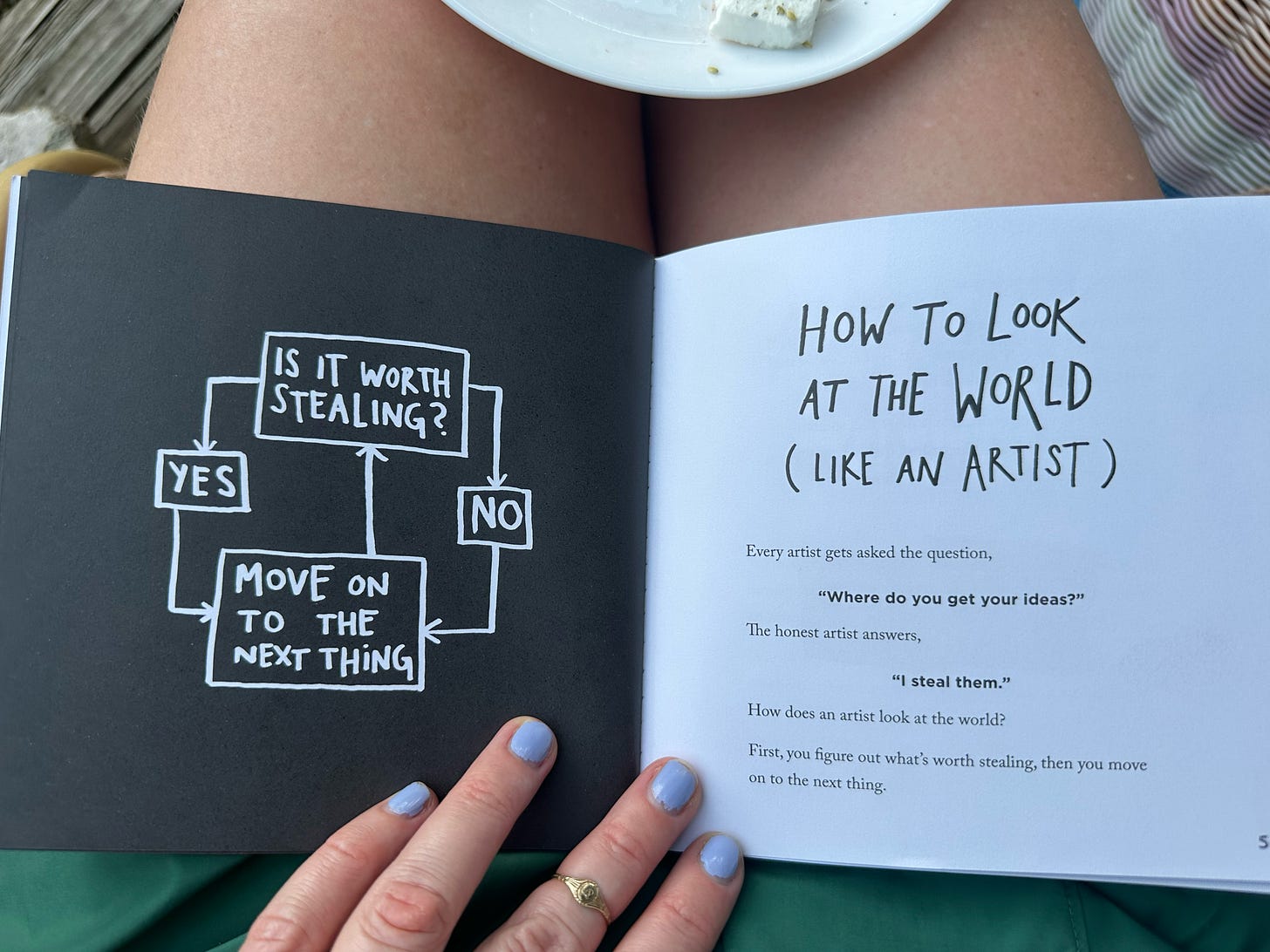 I can't resist bookstores. If I'm in one, I'll find something to get, which typically leads to a growing pile of books I need to read. But the last one I picked up is almost like a small coffee table book about creativity. So yesterday I wrapped up a little early after a major deadline, grabbed a chilly snack (watermelon and feta, if you must know), and sat outside with this book.